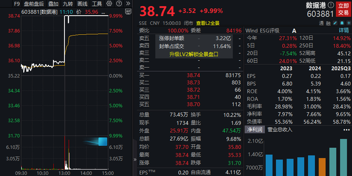 3月18日,受阿里云涨价消息刺激,A股算力、云计算、算力租赁等相关概念板块午后拉升。数据港(603881)午后开盘仅用时45秒就直线拉升至涨停,直至收盘仍有超3.22亿元资金“排队”。