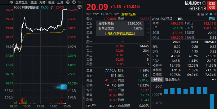 2月以来股价已实现翻倍的杭电股份,今日一度回踩月线,临近尾盘突然放量拉升封住涨停。