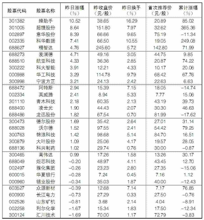 大众30指数成份股中,18日涨幅前五位的分别是蜂助手、超捷股份、意华股份、科华数据、精智达,涨幅分别为10.52%、8.64%、8.39%、7.41%和4.76%;跌幅榜上,汇川技术、利尔化学、山东矿机、长江电力等跌幅居前。