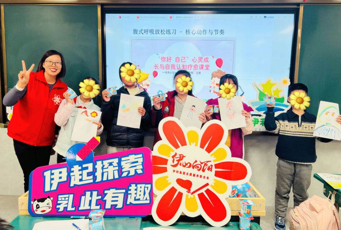 活动现场,志愿者们精心布置场地,营造轻松愉悦的学习氛围,让安全教育与心理关怀润物无声。心理健康环节,冥想引导舒缓心绪,绘画创作解锁心声,互动分享凝聚温暖,志愿者以温和姿态倾听孩子们的成长烦恼与美好心愿,在交流中传递善意与力量。活动中,志愿者代表企业赠送爱心酸奶与安全手册,将伊利的关怀具象化,让公益种子在孩子们心中扎根。