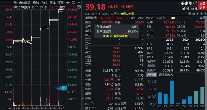 27日早间,美诺华开盘后仅用时5分钟便冲上涨停,走出“6天5板”,3月19日至今,该股累计涨幅已近50%。