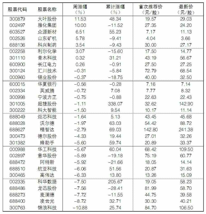 大众30指数成份股中,本周涨幅前五位的分别是大叶股份、雅化集团、众源新材、山东矿机、科兴制药,涨幅分别为11.53%、10.00%、6.51%、5.78%和3.54%;跌幅榜上,锦浪科技、凌云光、麦澜德、龙迅股份等跌幅居前。