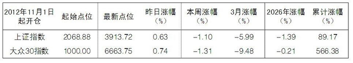 本报综合消息 本周,受地缘政治等因素的影响,大盘呈现探底后逐步企稳的走势。上证综指下跌1.10%,深证成指下跌0.76%,创业板指下跌1.68%,大众30指数下跌1.31%。