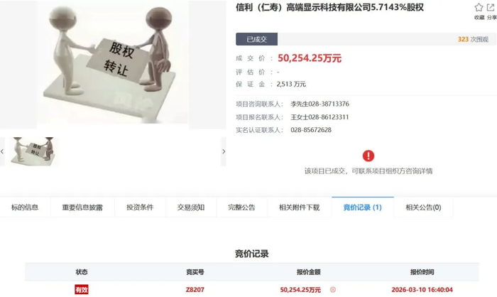 据西南联合产权交易所公开信息,3月10日,信利(仁寿)高端显示科技公司5.7143%股权已经成交,转让底价5.03亿元,成交价5.03亿元,转让方是仁寿县产业投资公司,接盘方信息不详。