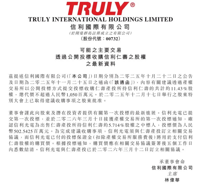 2026年3月12日晚间,信利国际(00732.HK)公告称,全资子公司——信利光电股份公司是信利(仁寿)高端显示科技公司5.7143%股权的中标人,投标价为5.03亿元,信利光电股份公司已于3月12日与转让方仁寿县产业投资公司签订交易协议。