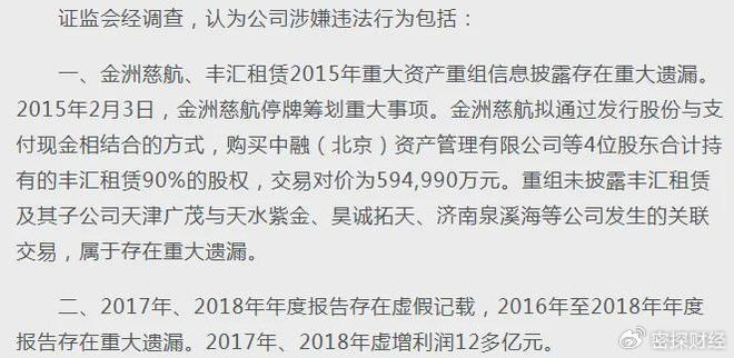 据公告表述,证监会查明上述违法事实后拟对金洲慈航、丰汇租赁除了责令改正及给予警告外,并分别罚款60万元等。2023年4月,金洲慈航被强制退市。