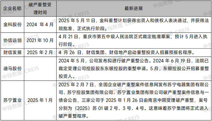 少数品牌房企选择采取破产重整方式解决债务危机,金科、协信远创重整草案已经获得法院批准,后续将进入执行阶段。财信发展、苏宁置业2025年也进入破产重整程序,迪马股份控股股东东银控股重整申请已被受理,此前迪马股份曾发布拟进行破产重整公告,准备工作完成后或将进入重整程序。