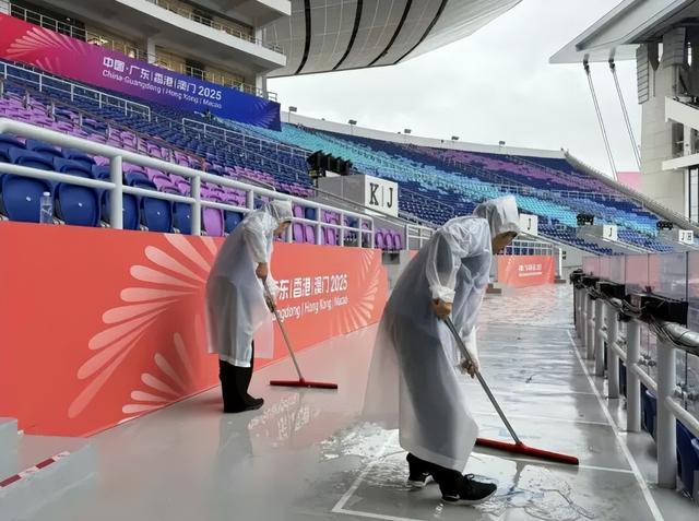 图:第十五届全国运动会开幕式前,珠江城市服务保洁人员清理看台积水