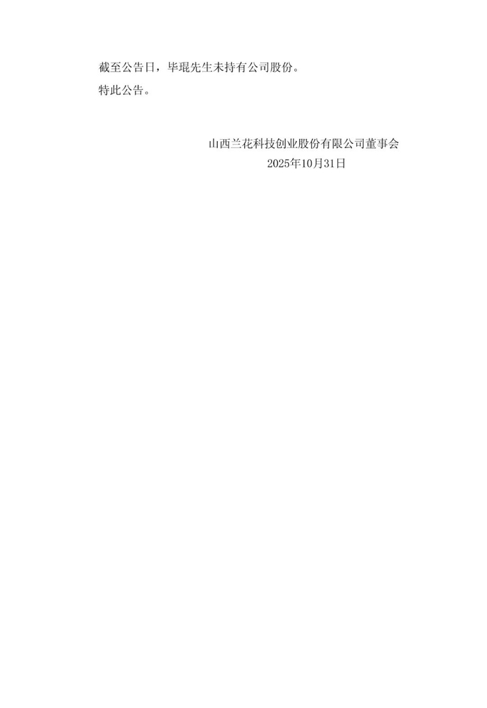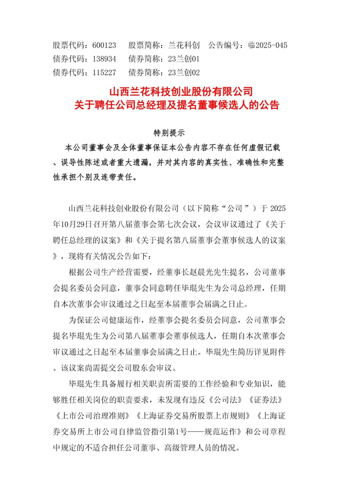 10月31日,兰花科创发布公告称,根据公司生产经营需要,董事会同意聘任毕琨为公司总经理,任期自本次董事会审议通过之日起至本届董事会届满之日止。