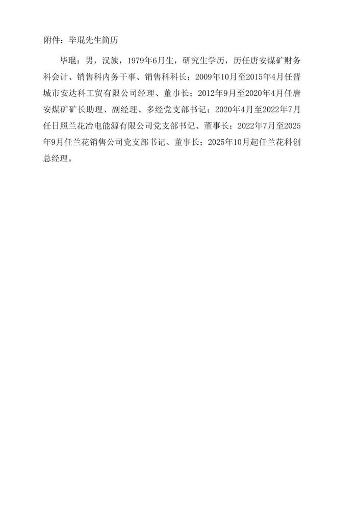 毕琨任山西兰花科技创业股份有限公司(以下简称“兰花科创”)总经理。