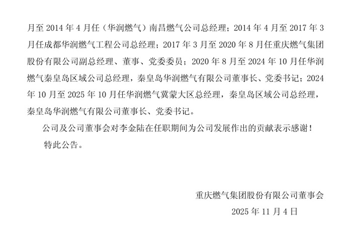 重庆燃气发布公告称,公司于11月3日召开第四届董事会第三十次会议,董事会同意李金陆不再担任公司董事长、董事职务,提名黄涌生为公司董事、董事长人选。