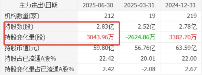 机构动态:二季度持股机构数达212家,较一季度增加193家,合计持股2.83亿股,加仓3043万股。
