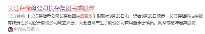9月25日早盘的消息,长江存储母公司长存集团完成股改。长江存储科技控股有限责任公司召开股份公司成立大会,大会选举产生了股份公司首届董事会成员。此举或意味着其股份制改革已全面完成,公司治理结构将全面升级。