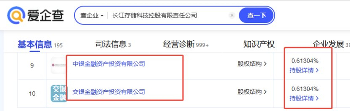 此外,交通银行、农业银行、建设银行分别通过交银金融资产投资有限公司、农银金融资产投资有限公司、建信金融资产投资有限公司间接持有长江存储0.61304%的股权。这三家资产投资公司均是交通、农行、建行的全资子公司。