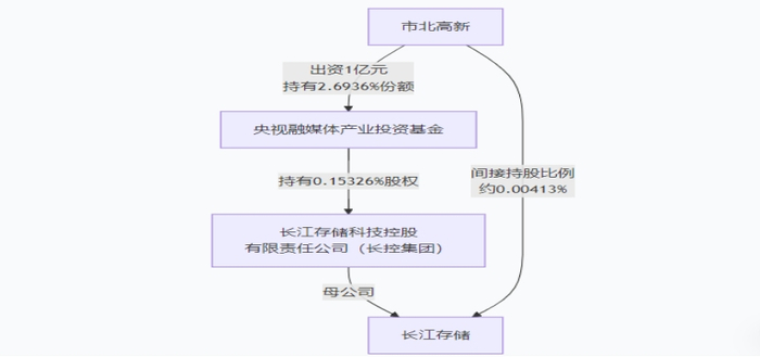 与长江存储股权关系:公司通过央视融媒体产业投资基金(有限合伙)间接持有长江存储股权。市北高新持有央视融媒体产业投资基金(有限合伙)2.6936%的股权,而央视融媒体产业投资基金则持有长江存储0.15326%的股权。整体拉看,市北高新间接持有长江存储0.00413%的股权,整体比例很低。