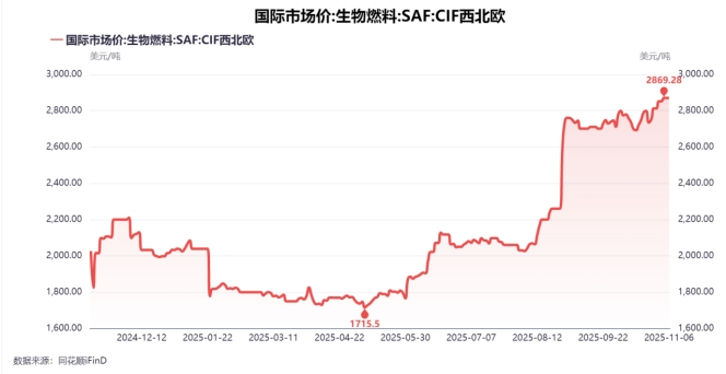 根据百川数据显示,11月7日欧洲SAF(可持续航空燃料)价格逼近2900美元/吨,创历史新高。