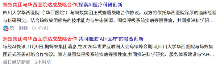 据蚂蚁集团消息,11月8日,在2025年世界互联网大会乌镇峰会期间,四川大学华西医院与蚂蚁集团正式签署战略合作协议。双方将围绕呼吸系统疾病等慢性病,共同推进科学研究、服务体系建设与“AI+医疗”的融合创新。