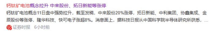 受此消息的影响,钙钛矿电池板块大涨,中来股份20%涨停,拓日新能、中利集团、协鑫集成、金辰股份等涨停。