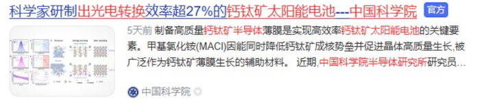 中国科学院半导体研究所团队在钙钛矿太阳能电池领域取得重要进展,研发出光电转换效率为27.2%的钙钛矿太阳能电池原型器件,并显著提升了其运行稳定性,为钙钛矿太阳能电池的产业化发展奠定了关键基础。相关研究成果在线发表于《科学》杂志。