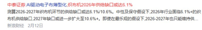 中泰证券表示,2026-2027 年织布机环节的供给缺口或达 6.1%/10.6%。在 AI 驱动的结构性增长趋势确立、设备供给短时间难以跟上的前提下,预计 2026 年织机供需缺口将贯穿全年,支撑电子布价格中枢持续上移; 2027 年供需矛盾或全面爆发,织布机分配压力更大,行业定价逻辑或全面转向稀缺性定价。