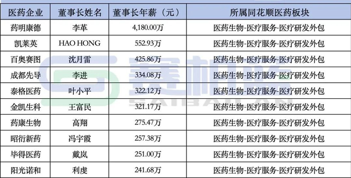 A股医疗研发外包板块董事长年薪TOP10中,药明康德的李革以年薪4180万元排在首位,且遥遥领先于其他企业,其次是凯莱英的HAO HONG(552.93万元)、百奥赛图的沈月雷(425.86万元)等。
