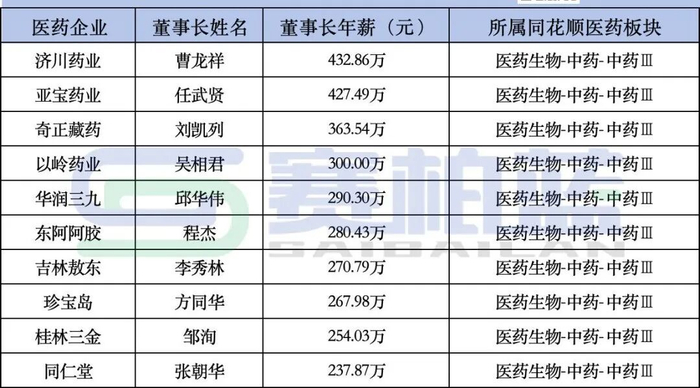 A股中药板块董事长年薪TOP10呈现薪酬集中化特征,整体差距相对不大。济川药业曹龙祥以432.86万元年薪位居榜首,亚宝药业任武贤、奇正藏药刘凯列分别以427.49万元、363.54万元紧随其后。