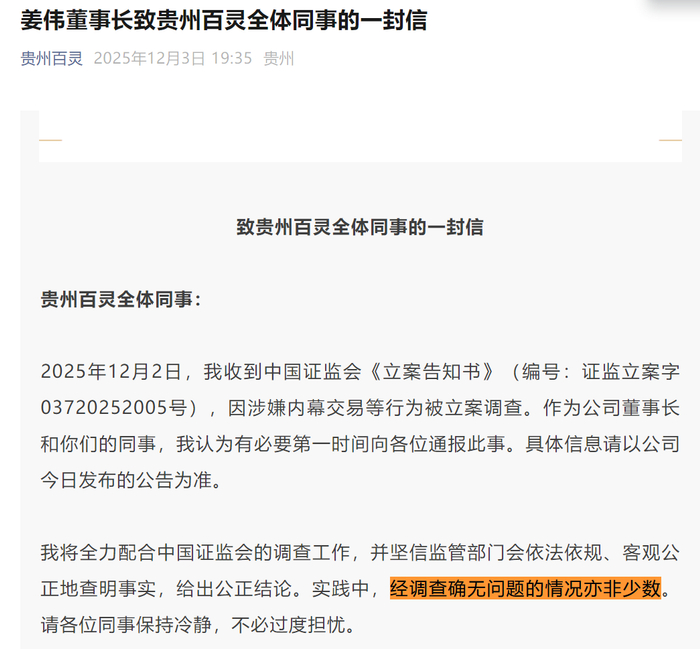 当日晚上,贵州百灵官方公众号发布了《姜伟董事长致贵州百灵全体同事的一封信》。