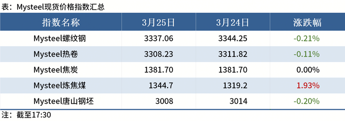 ◎3月25日,76家独立电弧炉建筑钢材钢厂平均成本为3403元/吨,日环比持平,平均利润为-85元/吨,谷电利润为26元/吨,日环比持平。