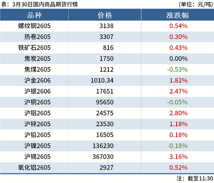 ◎铁矿石:30日青岛港进口铁矿主流品种市场价格上涨4。早间贸易商报价积极性一般,钢厂询盘偏弱。现60.8%PB粉786涨4,超特粉672涨4,61.6%PB块894涨4,卡粉949涨4,SPGF混合粉756涨4。(对比前一工作日晚间价格;单位:元/湿吨 )