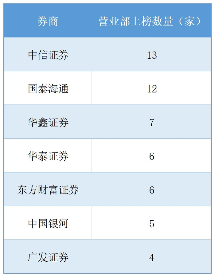 纵观百强营业部席位分布,中信证券旗下营业部有13家上榜,数量居首;其次为国泰海通,旗下有12家营业部上榜;华鑫证券有7家营业部上榜,华泰证券、东方财富证券均有6家营业部上榜。