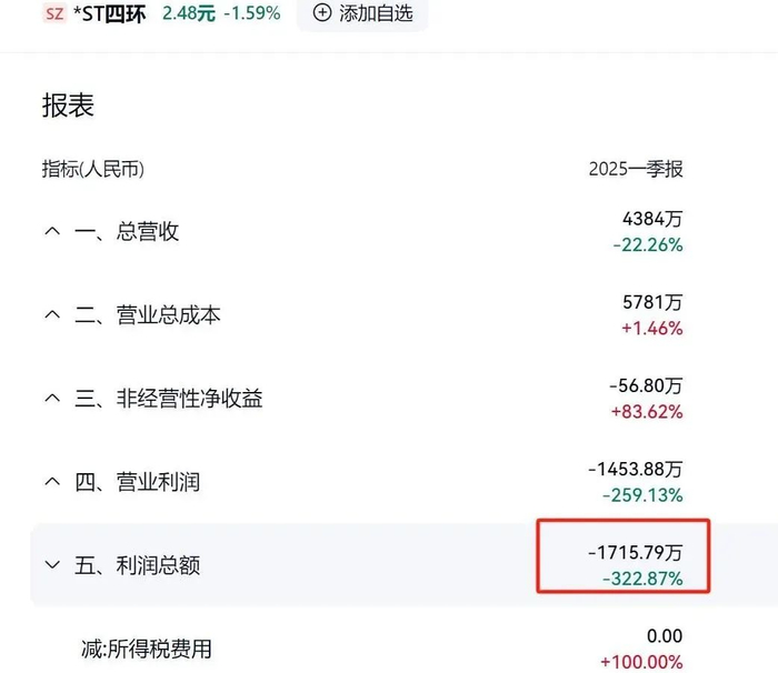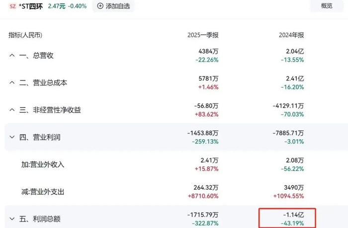 留下的是一个被掏空的壳和一地鸡毛。截至2025年第一季度四环生物仍在亏损,亏损额为1715.79万元。如今徘徊在退市边缘的它,就是资本退潮后那个赤裸的真相。