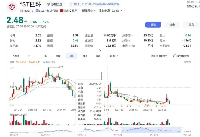 大佬出事公司遭殃。四环生物的市值从2018年前后百亿的巅峰,一路狂泄至2025年6月的26亿元,缩水超过七成。可怜的是那10.28万户散户。