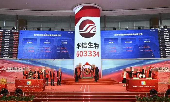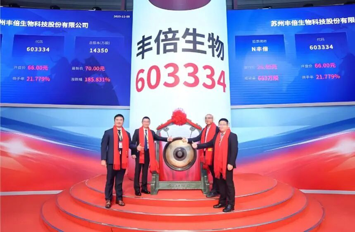 图源:上海证券交易所上市当日,丰倍生物的开盘价为每股66元,较发行价的每股24.49元,大涨超169.49%,总市值超95亿元。