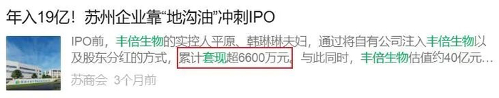 据苏商会、江苏经济报等官媒报道称,丰倍生物在上市前,实控人平原夫妇曾通过各种方式进行套现分红,两人累计套现超6600万元。