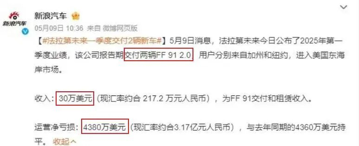 尽管一季度才交付了两辆新车,收入也才30万美元,运营净亏损为4380万美元,怎么看都像是“勉强硬撑着”。