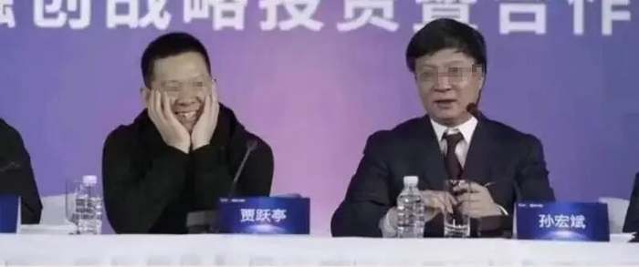 左贾跃亭右孙宏斌一旁的贾老板双手撑着下巴笑着,只是现在看来,孙宏斌是笑不起来了。