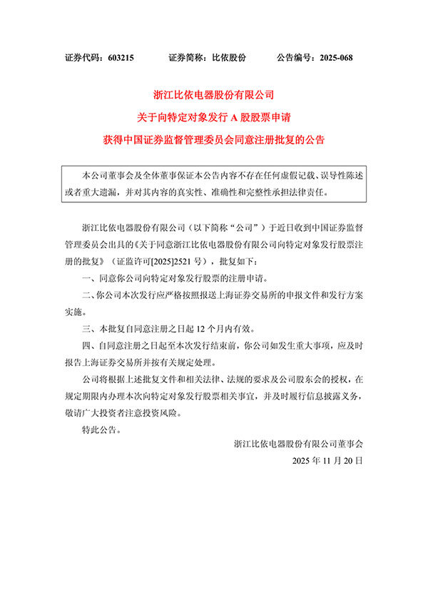 11月20日,浙江比依电器股份有限公司宣布定增募资4.82亿元获证监会批复,将全部用于智能厨房家电建设项目,建成后年新增1500万台小家电产能。