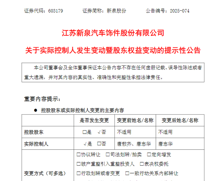 12月3日晚间,新泉股份发布公告称,公司实际控制人唐敖齐先生于2025年10月26日逝世,其持有的新泉投资51%股权中50%归属其配偶,50%为遗产。但因朱玉琴女士放弃继承权,公司的实控人也随即发生变化。