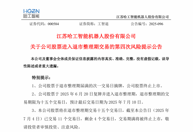 2023年起,公司连续三年扣非净利润为负,触发强制退市红线。2025年6月,哈工智能进入退市整理期,7月10日摘牌。三年时间,市值蒸发超80%,商誉成了废纸,债务无人兜底,留下一地鸡毛。