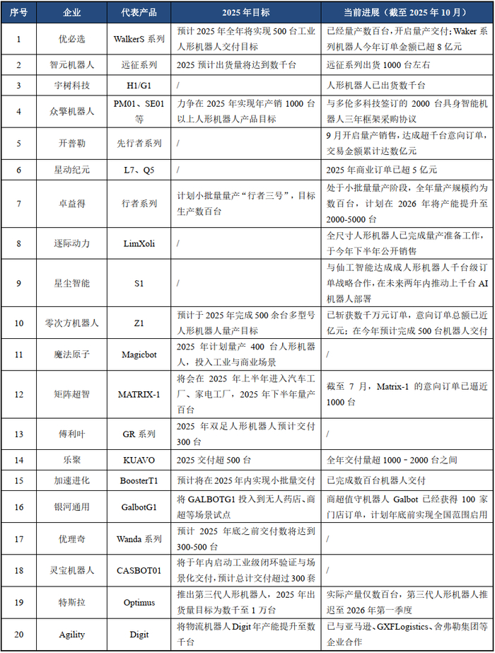 整体来看,国内企业在量产交付与商业化进度上领先。特斯拉Optimus实际产量仅数百台,第三代产品推迟至2026年发布;国内头部人形机器人企业已进入量产交付与场景落地的关键阶段,头部企业量产能力突出:优必选、智元、宇树科技等已实现数百至数千台交付,订单金额超数亿元;乐聚、加速进化、星动纪元等企业也完成数百台至千台级交付,商业订单规模可观。
