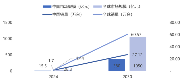 市场层面的需求为行业发展提供了强劲动力,从工业制造向医疗康养、商业服务、特种作业等多元领域渗透,进一步打开了市场增长空间。根据《宇树机器人招说明书》披露的信息,2024年中国人形机器人市场规模约为15.5亿元,约占到全球的53.8%。预计到2030年,国内人形机器人市场规模有望达到380亿,销量有望达到27.12万台,年复合增长率CAGR约70.4%。