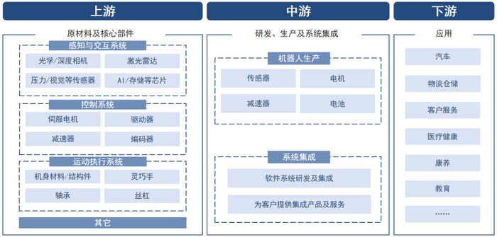 人形机器人产业链由上游核心零部件、中游整机制造和下游应用场景三大环节构成,上游核心零部件占整机成本约70%,主要包括感知系统、决策系统和执行系统,感知系统以视觉力觉触觉等多模态传感器为主,决策系统以AI芯片和算法为核心,执行系统包含减速器丝杠电机等关键部件,中游企业主要开展整机系统集成与量产制造,下游应用场景则从工业向商业服务和家庭服务逐步拓展。