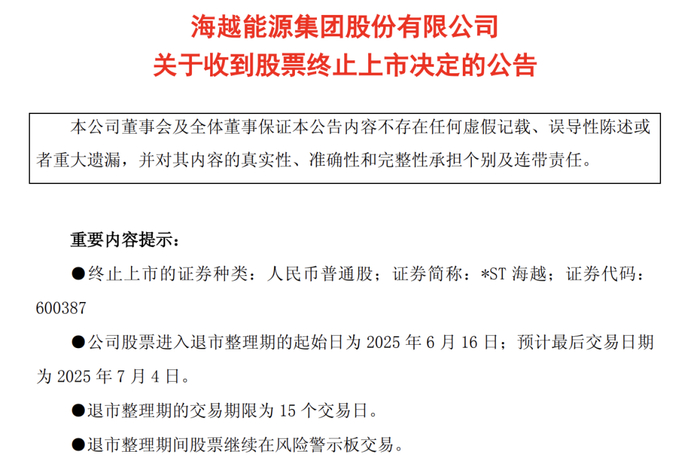 6月6日,来自诸暨的*ST海越公告,当天,上交所决定终止公司股票上市。公司股票退市整理期为15个交易日,预计最后交易日期为7月4日。