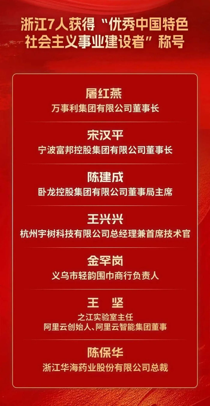 今年7月,万事利实控人屠红燕、宁波富邦实控人宋汉平、卧龙电驱实控人陈建成、华海药业实控人陈保华、宇树科技总经理王兴兴等7人被评为全国“优秀中国特色社会主义事业建设者”称号。