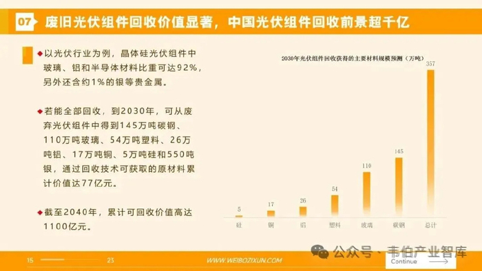 三、2030年中国将回收150万吨报废光伏组件,市场规模超千亿CPIA预测:到2030年中国将回收150万吨报废组件,2050年将达到2000万吨。随着近年来的大规模既有项目的技改,中国光伏组件回收高峰将提前到来。以光伏行业为例,晶体硅光伏组件中玻璃、铝和半导体材料比重可达92%,另外还含约1%的银等贵金属。若能全部回收,到2030年,可从废弃光伏组件中得到145万吨碳钢、110万吨玻璃、54万吨塑料、26万吨铝、17万吨铜、5万吨硅和550吨银,通过回收技术可获取的原材料累计价值达77亿元。截至2040年,累计可回收价值高达1100亿元。图表5:2030年光伏组件回收获得的主要材料规模预测(万吨)