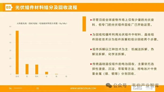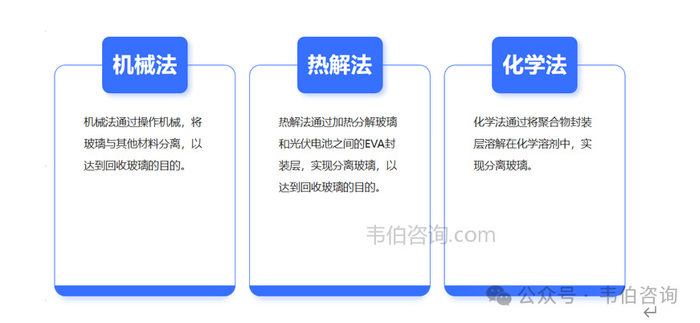 资料来源:Wind、韦伯咨询为回收和循环利用光伏组件中材料,晶硅组件回收技术分为组件拆解和组分回收两个步骤。(1)组件拆解组件拆解以三种技术为主:机械法拆解、热解法拆解、化学法拆解。1)机械法通过操作机械,将玻璃与其他材料分离,以达到回收玻璃的目的。2)热解法通过加热分解玻璃和光伏电池之间的EVA封装层,实现分离玻璃,以达到回收玻璃的目的。3)化学法通过将聚合物封装层溶解在化学溶剂中,实现分离玻璃。图表4:光伏组件拆解的三种主要技术