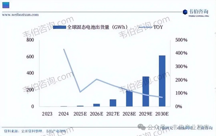 固态电池发展正处初期阶段,目前产业化以半固态电池为主。2024年全球固态电池出货量约5.3GWh,同比增长430%,预计2030年将达到614GWh。