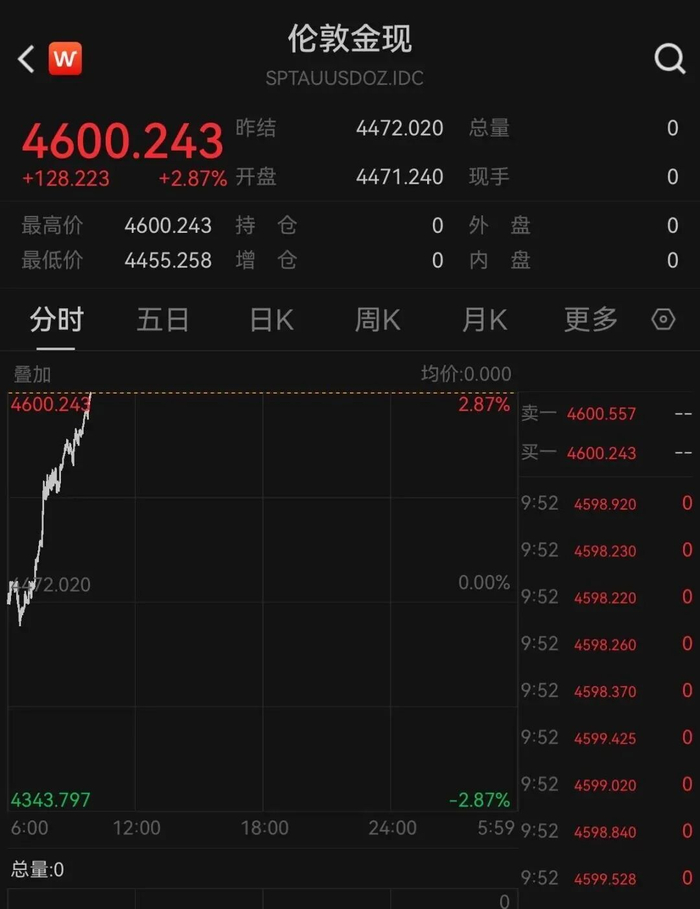 截至北京时间25日上午9时45分,伦敦现货黄金价格报每盎司4595.66美元 ,日内涨幅近3%。截至北京时间上午9时30分,纽商所黄金期价主力合约报每盎司4578.40美元,较前一天收盘时上涨4.01%。纽商所白银期价主力合约报每盎司74.110美元,较前一天收盘时上涨6.53%。