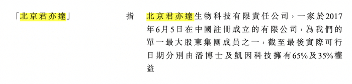 2017年8月,潘海与凯因科技共同出资200万元,成立了先为达。公司初始股权结构中,潘海直接持有50%的股份,另外50%则由潘海与凯因科技联合设立的北京君亦达生物科技有限责任公司(以下简称“北京君亦达”,双方各持股65%、35%)持有。