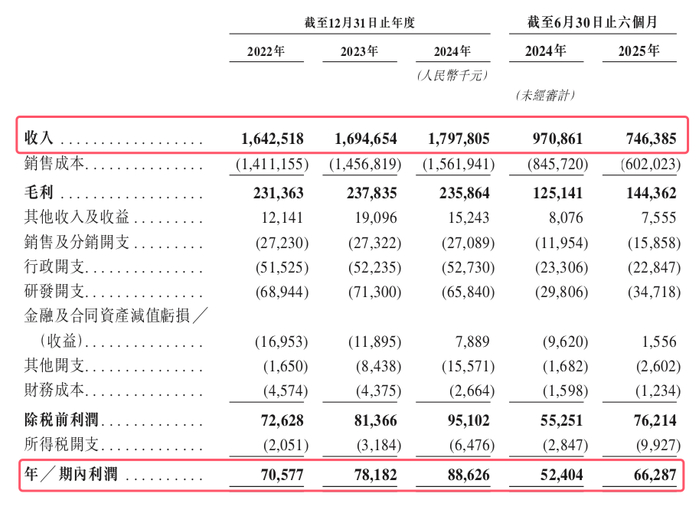 据更新后的业绩数据,2022年至2024年及截至2024年及2025年6月30日止6个月,公司收入分别为人民币16.43亿元、16.95亿元、17.98亿元、9.71亿元及7.46亿元,净利润分别为7057.7万元、7818.2万元、8862.6万元、5240.4万元及6628.7万元。